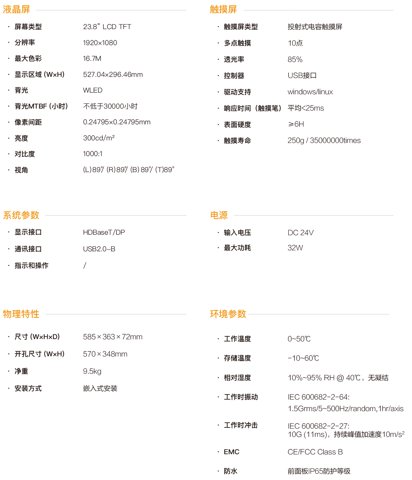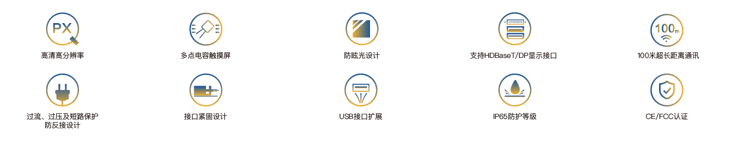 SPD-2400E是一款嵌入式超薄型工業(yè)觸控面板,配備23.8寸分辨率為1920×1080的高清液晶顯示屏、投射式多點電容觸摸屏,支持 HDBaseT和 DP信號傳輸接口,多個USB接口擴展,PC與觸控面板最遠通訊距離可達100米,整機DC24V供電,前面板IP65防護等級,接口全部采用緊固設計,且通過CE/FCC認證,可適用于嚴苛的人機交互工業(yè)現(xiàn)場。